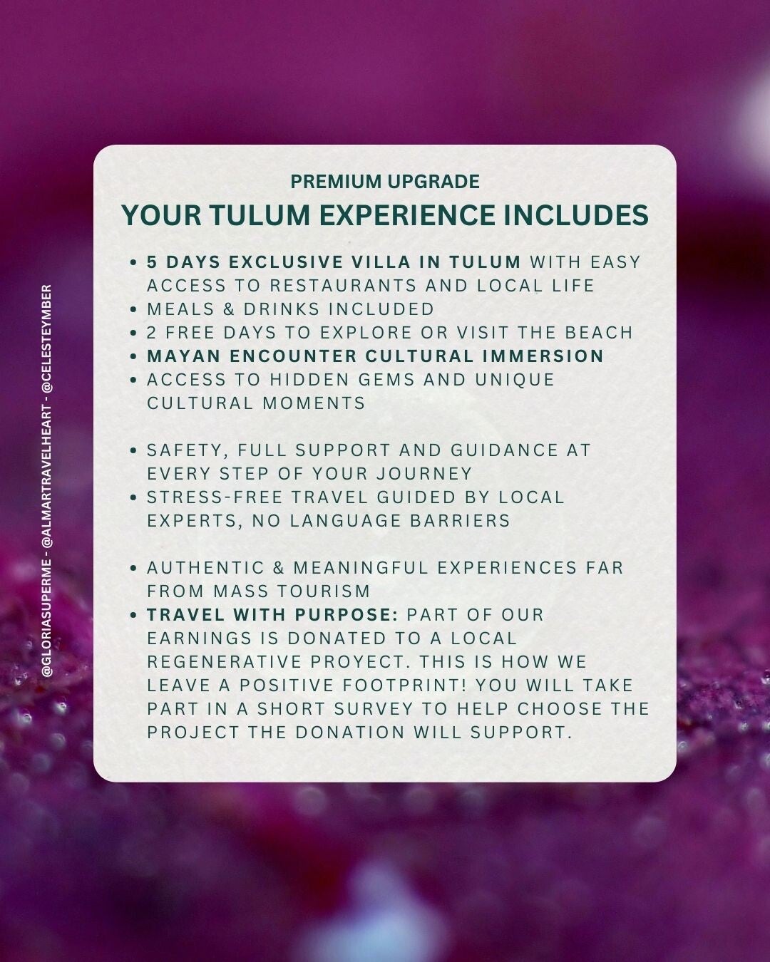 - Beperkte plaatsen: 10 deelnemers retreat / 4 deelnemers Tulum