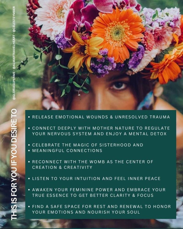 Verder wordt geleid door Gloria Vázquez, Celeste Ymber en Michéle Wezel, die je met hun aanwezigheid, ervaring en zachte kracht begeleiden op een diepe reis naar verbinding met jezelf en de natuur.